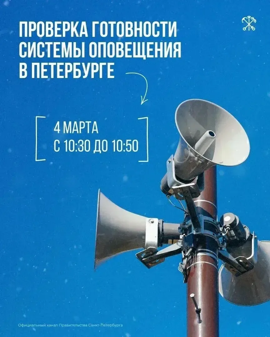 4 марта в Петербурге проверят региональную систему оповещения населения о ЧС. С 10:30 до 10:50 во всех районах города будут включены сирены и уличные громкоговорители.